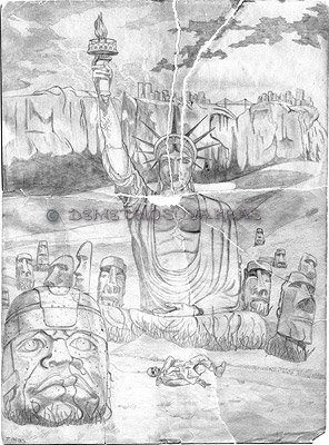 Perched precariously on a cliff-top remain the last vestiges of man's civilization -buildings symbolic of man's 'higher' intelligence, his ability to construct, to create - his material obsessions. In the immediate foreground are scattered the abandoned relics of his past - abandoned to the solitude and desolation of the dessert wilderness, to the extremities of nature, left to crumble under a scorching sun, ... Here the grass is beginning to reclaim what once belonged to nature, the statues sculpted from stone slowly being reintegrated from whence they were extracted. These