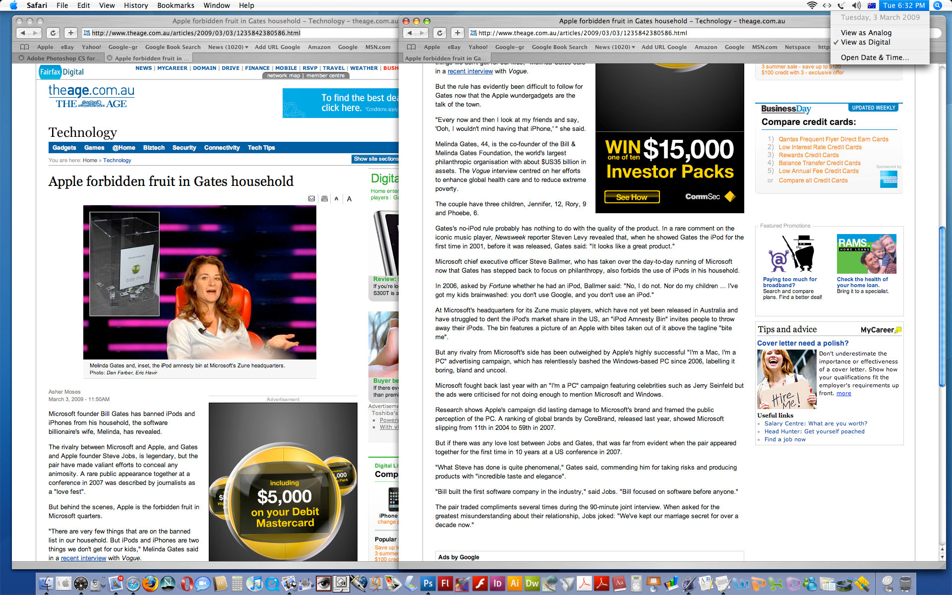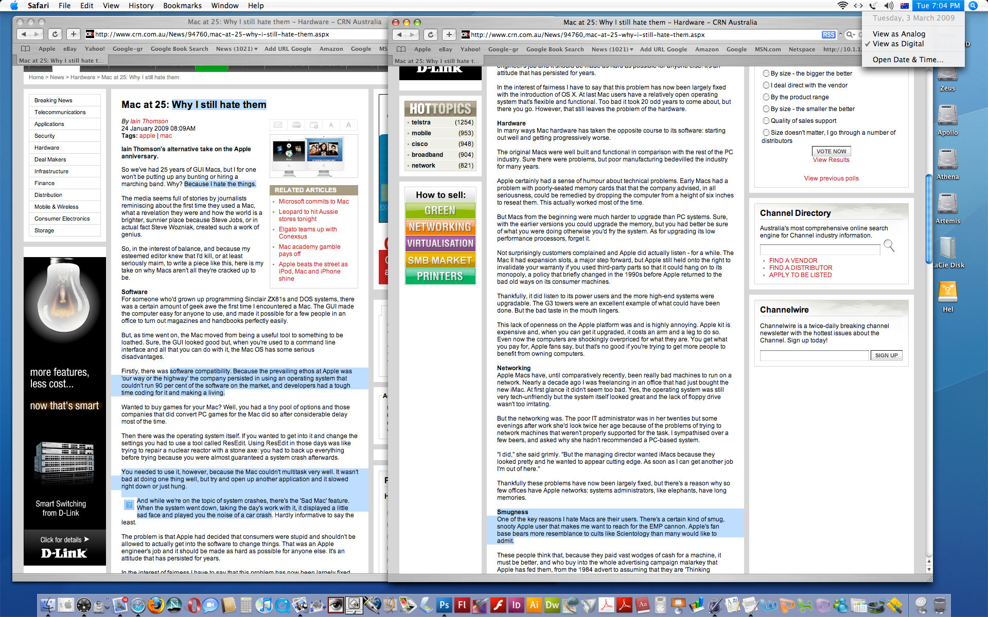 Thomson claims: You would imagine that Apple just introduced changes after 20 years! But the OSX "fix" (as he calls it) came out in 2001! As for the ability of Mac users to modifiy their computer's hardware, my G3 (purchased in 1998) had a number of expansion bays, pci slots, memory slots, etc. Why is he comparing Windows machines to ancient Macs as they might have been over a dozen years ago? Thomson also lambasts Apple's lack of compatibility with Windows: